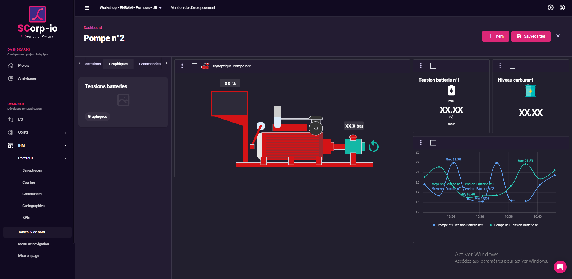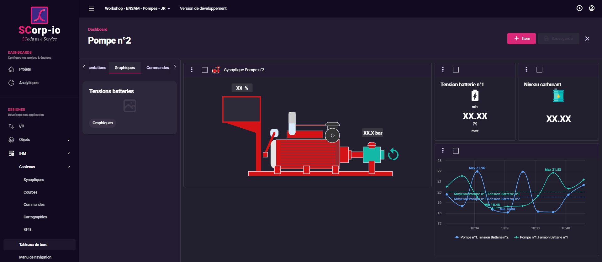 Pour insérer une courbe, **cliquer sur "Graphiques" dans le menu déroulant sur la gauche**. **Choisissez la la courbe correspondante** (ici "Tension batteries"). Enfin **faite un glissé + déposé dans l'item.**